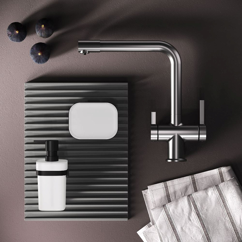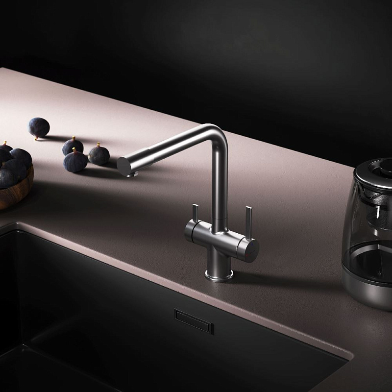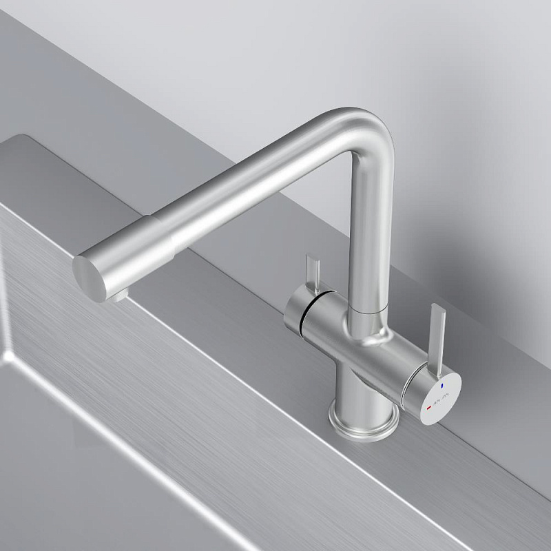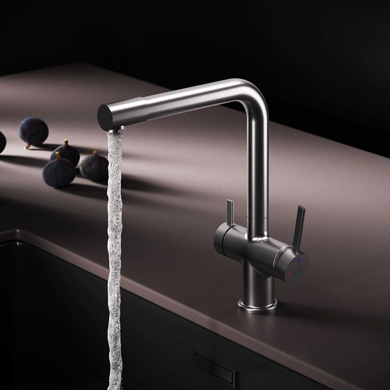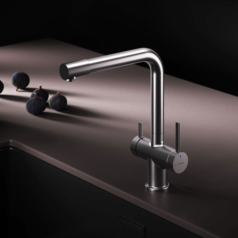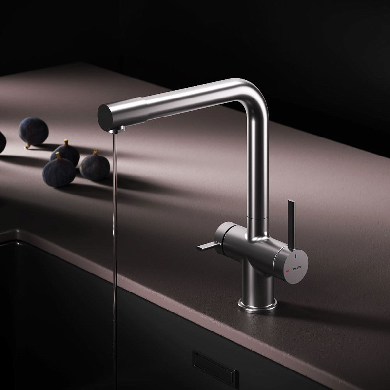 Встречайте долгожданное пополнение нашумевшей коллекции Func — кухонные смесители с оригинальными «фишками», характерными для всей коллекции. Дизайн, характерный только для премиум-сегмента, благодаря собственным дизайнерам бренда теперь представлен и в более доступной ценовой категории. Смеситель оснащён встроенным каналом для подачи питьевой воды. Чтобы получить питьевую воду, воспользуйтесь ручкой, расположенной с левой стороны корпуса; для обычной воды управляйте смесителем привычным образом. Размер (Ш/Г/В): 135x265x298 мм. Материал - нержавеющая сталь, цинк, латунь. Цвет - сатин. Тип управления - однозахватный. Излив - поворотный.