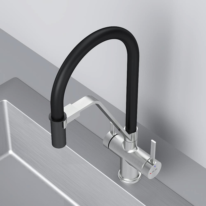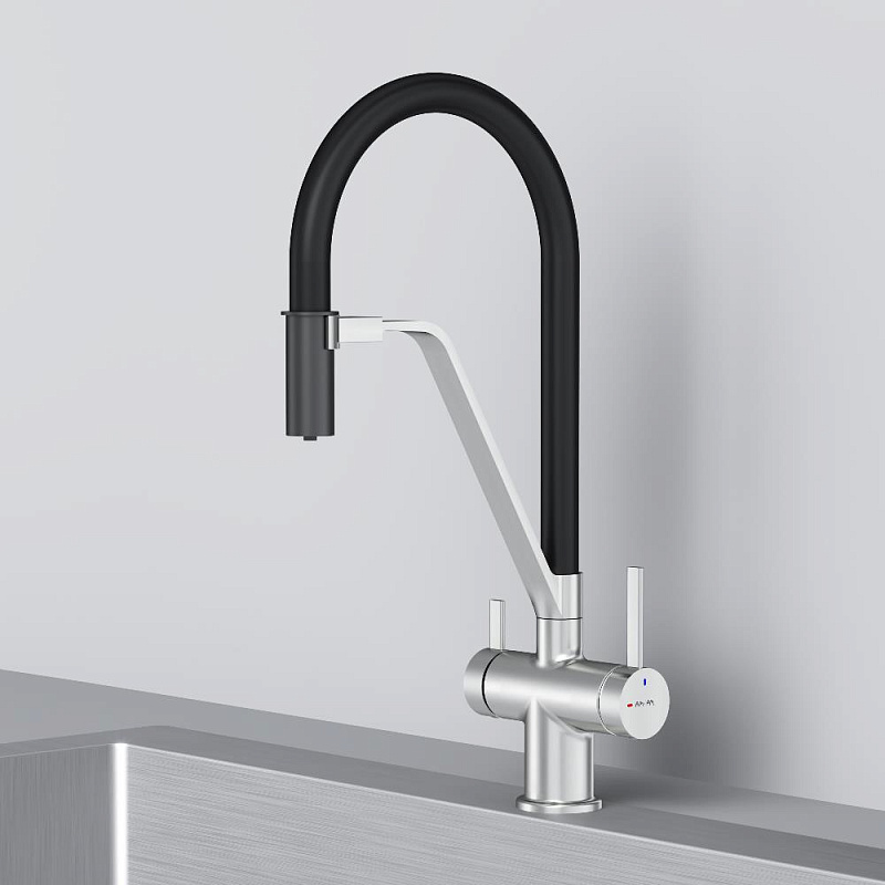 Смеситель для кухни AM.PM Func F8F07812 высокий, сатин с каналом для питьевой воды и гибким черным изливом