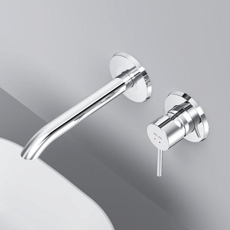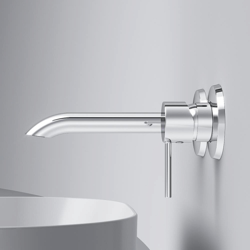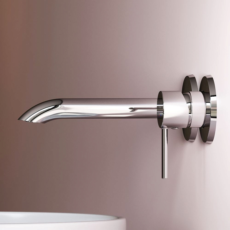 Выверенный изгиб в сочетании с чистой горизонталью излива подчёркивает архитектурную чистоту формы. Такое решение требует высокой точности производства и формирует цельный, визуально безупречный силуэт. А монтируемая в стену конструкция – это ответ на меняющиеся потребности клиентов, которые ищут простые и стильные решения для ванной комнаты. Размер ручек (Ш/Г/В): 49x49x62,8 мм. Размер излива (Ш/Г/В): 190x222x116 мм. Материал - латунь. Цвет - хром.